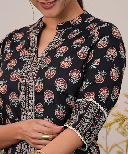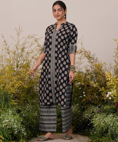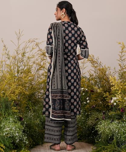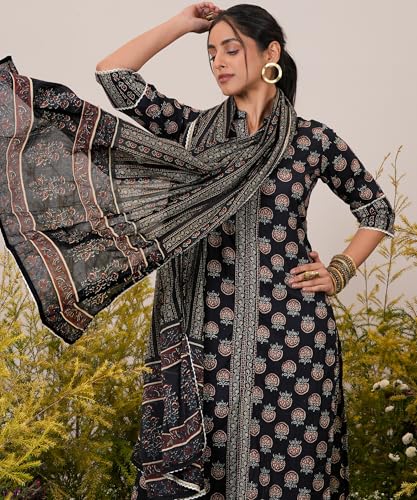 Miraan Cotton Printed Readymade Salwar Suit For Women(MIRAANBAND1607, Black)